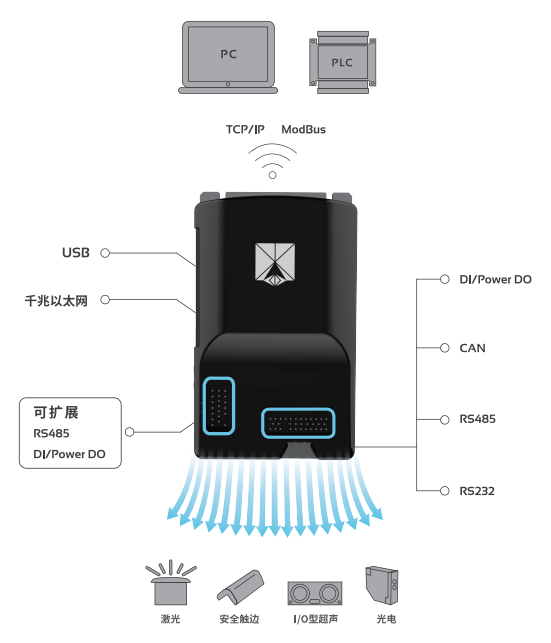 可适配任意I/O型的红外、超声、光电等传感器,如Tokyo Sensor 触边、欧姆龙E3Z-D61、SICK OD1-B150F0AQ15 NPN、北阳DMS-HB1-N、倍加福 UB100-F77-E0-V31等。