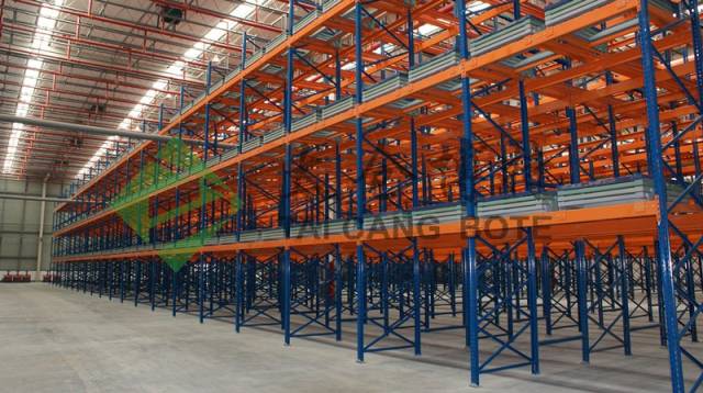 高空间利用率的后推式货架按种类可分为:承载 ≤1000KG,轻中型;承载1000KG—1500KG为重型;≥1500KG,超重型。