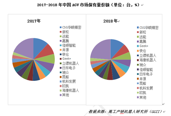 GGII数据显示,截至2018年底,从企业累计销量来看,制造业领域AGV应用依靠长时间的累积,累计销量较大,诸如CSG华晓精密、新松、远能、嘉腾市场份额仍占据市场前列。