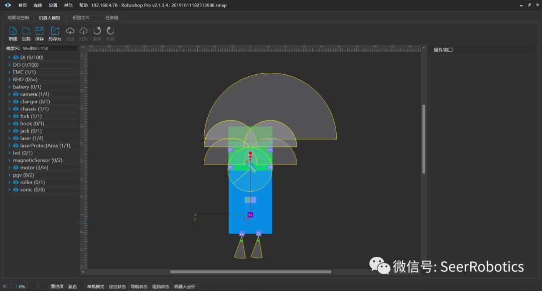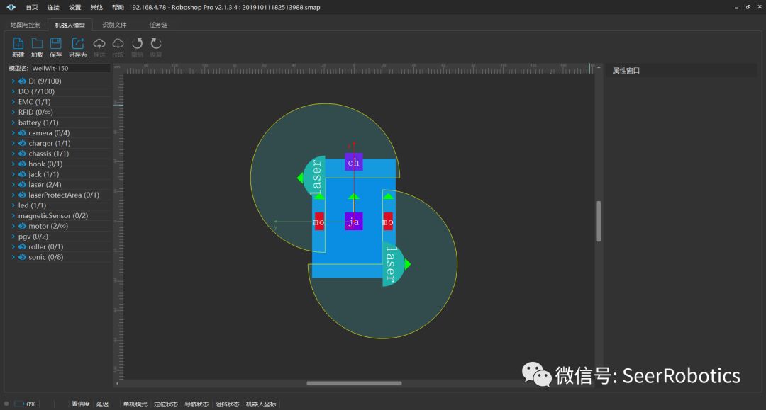 仙知工程师利用可视化操作软件为观众展示快速完成移动机器人模型搭建。通过在左侧菜单栏选择激光、驱动器、电机、I/O型传感器、电池等各类核心零部件,并在右侧属性栏对已经适配好的多种品牌产品进行勾选,即可快速完成机器人模型创建,十分简单。