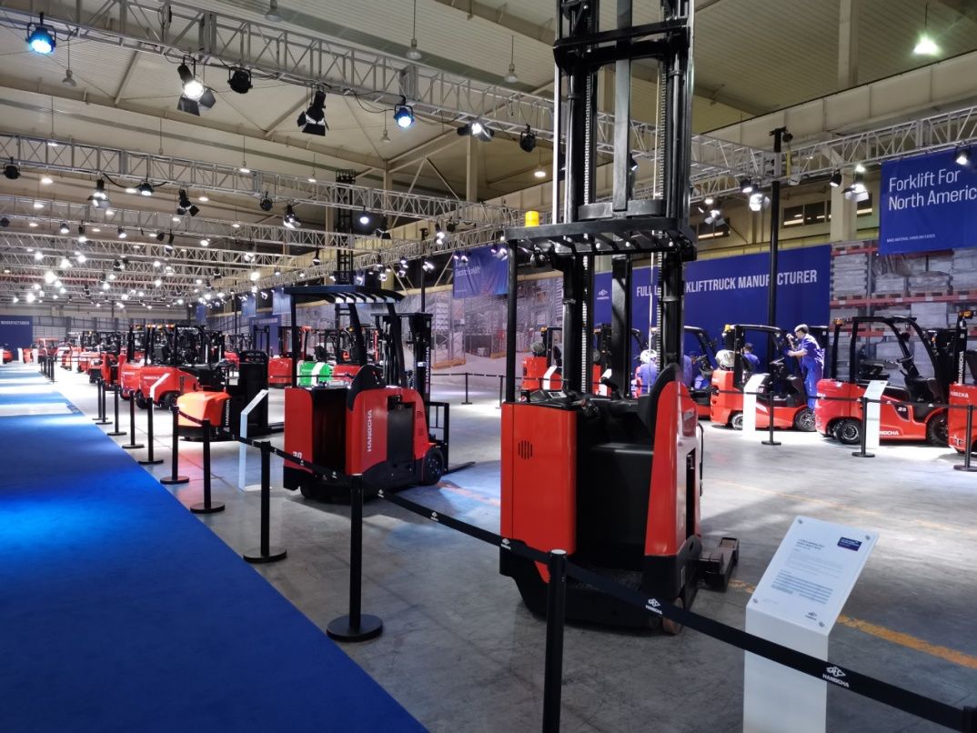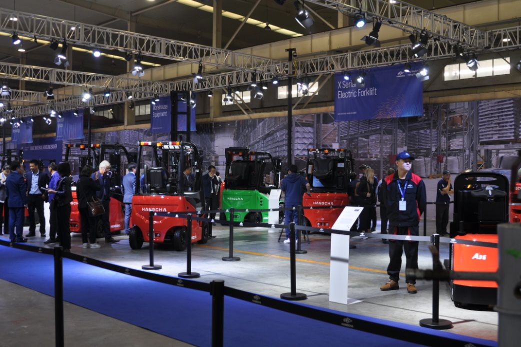 新产品展示现场分为新产品发布区、锂电产品展示区、北美产品展示区、概念车展示区、仓储车展示区、细分市场展示区、大吨位车展示区、X系列电动叉车展示区、AGV演示区、新能源产品展示区、高空作业设备展示区及属具展示区等,参展产品和零部件共计200余台套,向全球代理商和客户集中展示了杭叉新开发的工业车辆和核心部件。