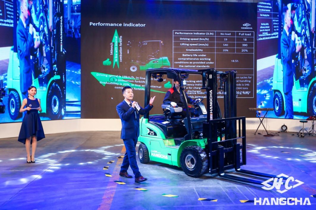 作为代理商大会嘉年华活动的一个重要环节,XC系列新能源叉车隆重发布。该车车身采用醒目的绿色,寓意绿色环保、清洁能源。它采用全新跨界外形,专为替代内燃叉车而生。其专用架构,突破传统电动叉车设计方法,集内燃叉车和电动叉车优势于一体,在性能、防水等级、视野、人机工程、安全环保等方面远远超越传统铅酸电池电动车辆。