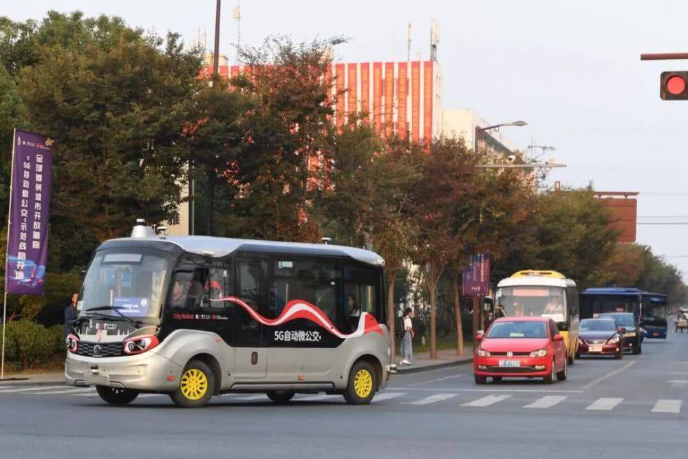 一辆“5G自动微公交”行驶在浙江省桐乡市乌镇姚太线街头