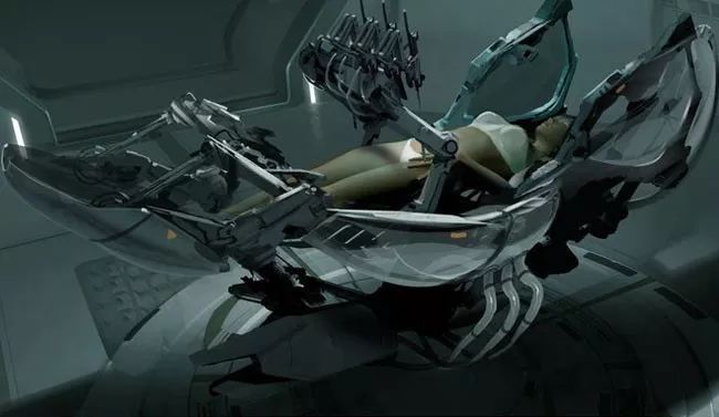 美国电影普罗米修斯画面,用在宇宙飞船上的未来全自动手术仓,包含了影像扫描,全自动手术机器人以及人工智能: