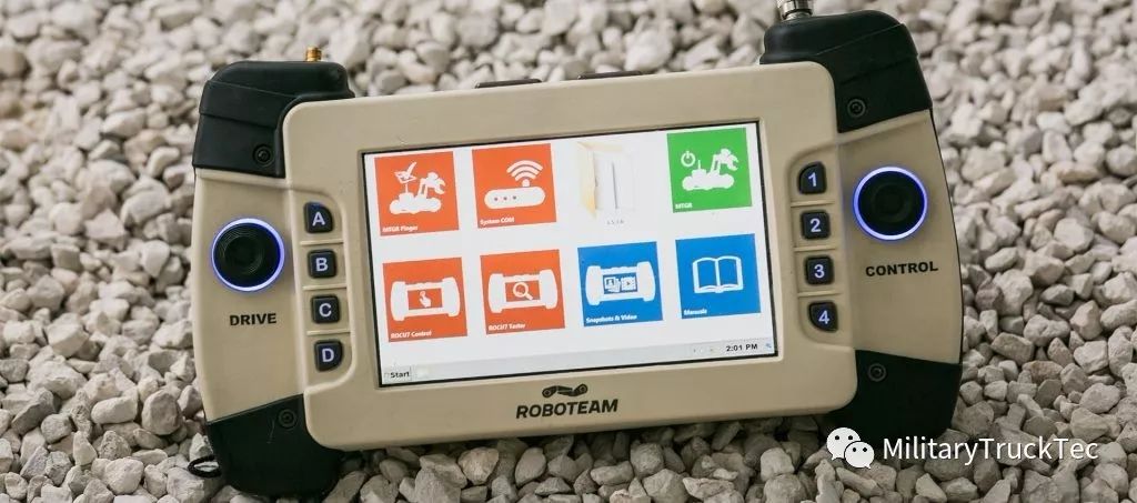 Probot无人车可通过RobotTeam公司的Rocu-7型控制模块通过安全加密的无线网络进行操纵。通过该控制模块操控几个其他无人系统,如IRIS侦查机器人小车(不了解的同学,请自动点击链接涨姿势:[视频]战场之眼-可抛式单兵机器人小车)。Rocu-7控制模块具有八个硬按钮,两个操纵杆和一个用于无线电通信的RP-TNC插孔,手持单元通过加密的IP Mesh通信系统与Probot UGV通信。该控制模块一次工作时间可达3-6个小时,适应-20℃-60℃的环境温度。