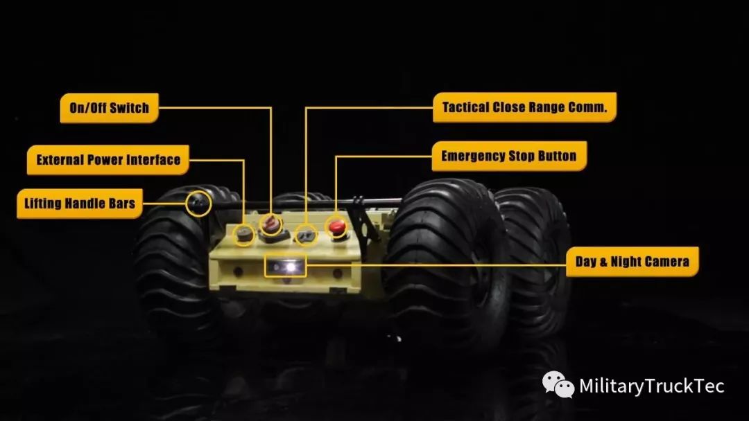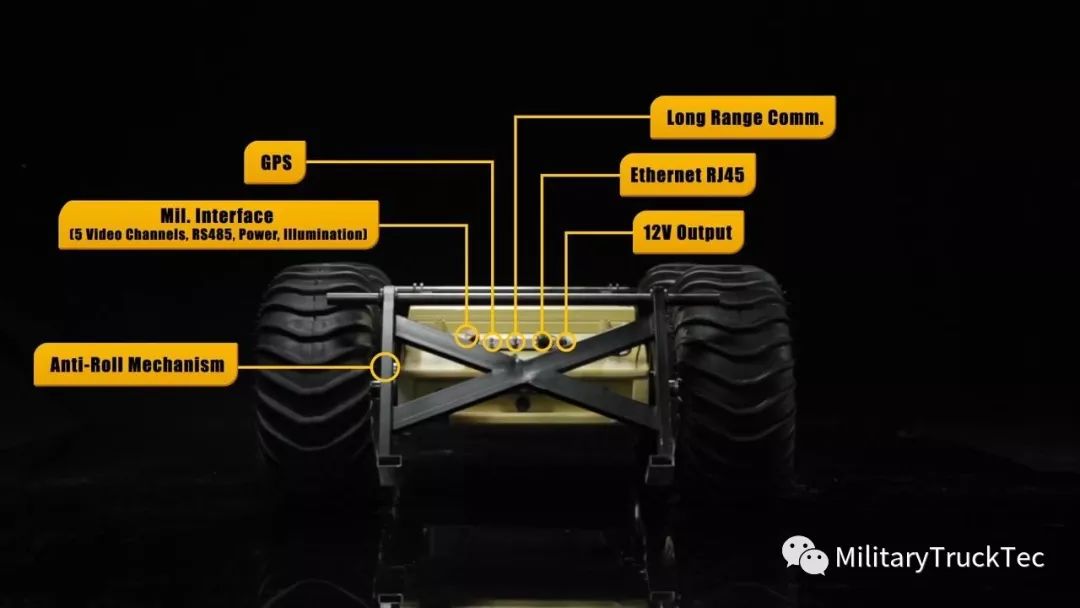 除此之外,通过增加外设,还可以安装具有360°摇摄,上下俯仰15°/-30°的云台摄像机,由此作战人员可以遥控将无人车秘密驶入敌前沿阵地,进行前沿侦查。该车辆最多可容纳八个摄像头,用于执行情报和搜索操作。