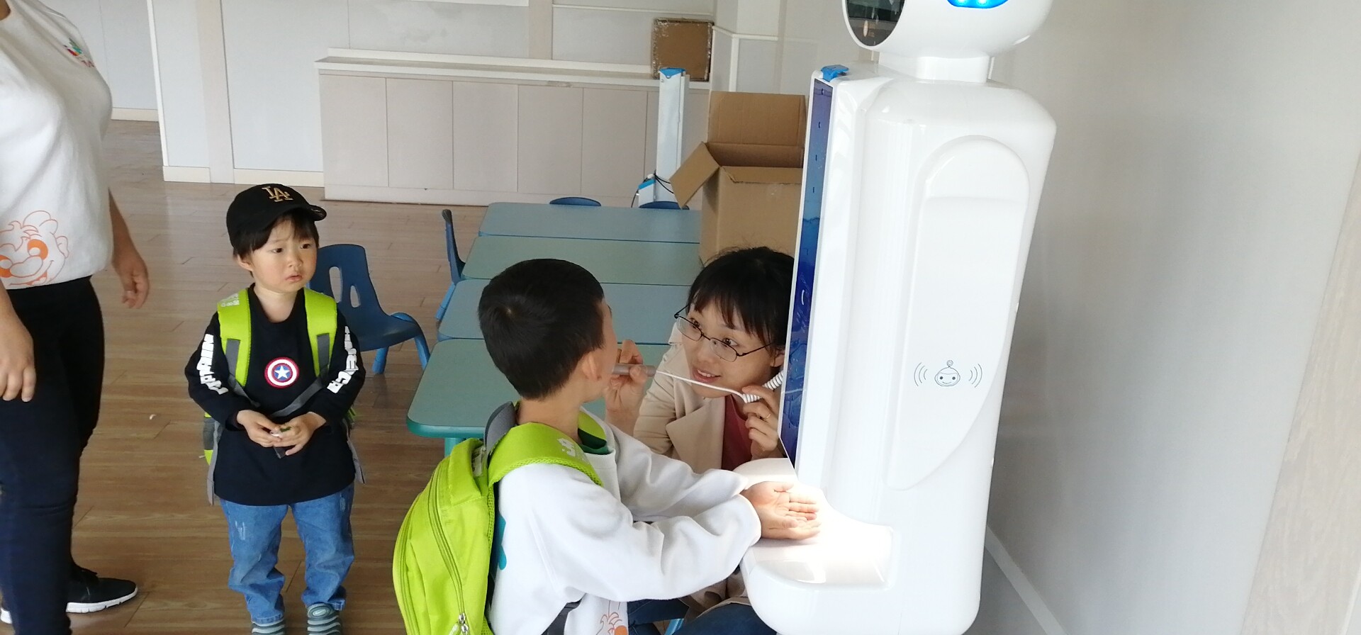 老师向我们介绍到:“孩子只要站上这台晨检机器人,就能智能检测到他的身高、体重、体温还有手上是否有手足口的症状,还能帮忙记录所有数据,比保健医生这样人工检测来说,机器人检测真的是又快又方便!”