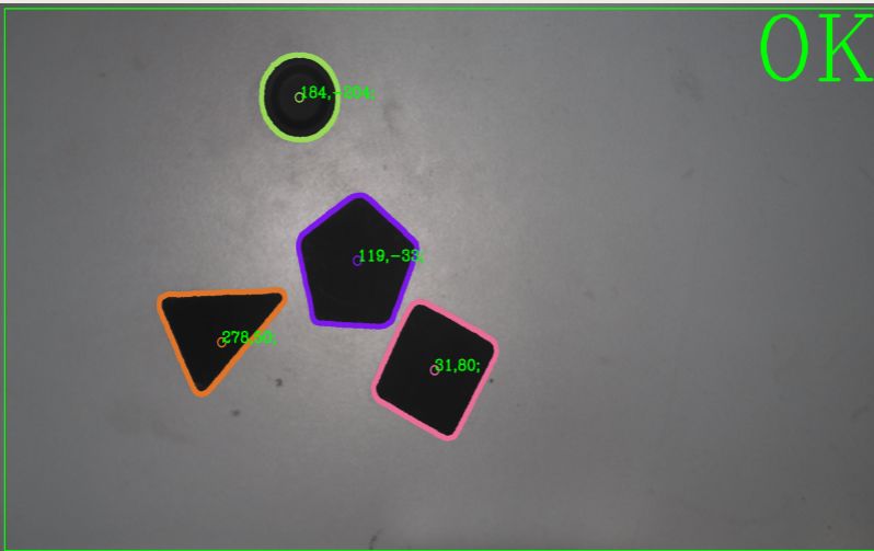 (1)考虑到轮廓特征是一种在无纹理背景中可被稳定识别的特征,具有对环境光变化不明显等优势。因此采用基于轮廓特征的匹配方法定位识别目标物体。当与模板图像匹配成功时,软件界面会显示OK状态,当匹配失败时,显示NG状态。