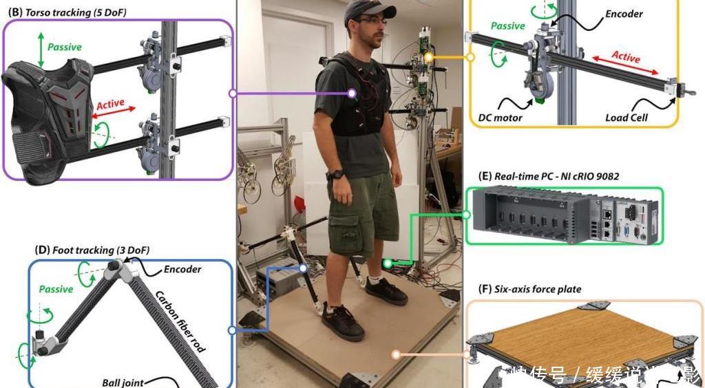 (F)测力板,用于估计操作员的压力中心位置,并测量操作员净接触力的切向力和法向力。