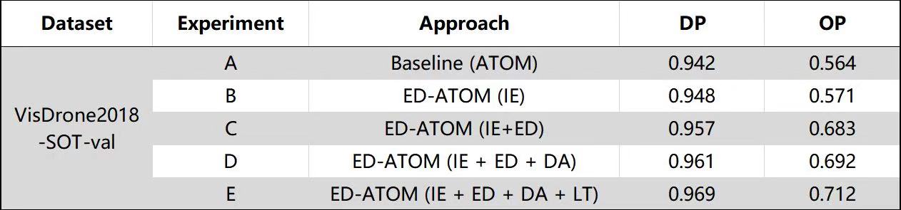 结合IE(图像增强)、ED(通过增强数据训练的IOU预测网络)、DA(在线数据增强)、LT(长期跟踪)几种方法的ED-ATOM算法,联合研究团队最终杀出重围,以最优成绩刷新了世界纪录。