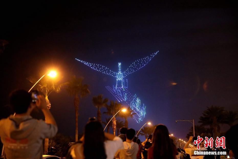 11月17日晚,在厦门会展中心沙滩,1200架无人机腾空而起以黑夜为背景,伴随音乐节奏变换出各种造型,迎接即将到来的第28届金鸡百花电影节。图为无人机变幻成厦门“市鸟”白鹭造型。