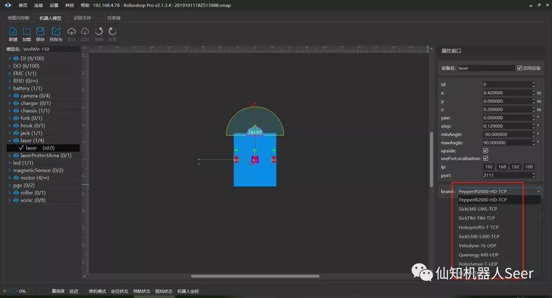 同时,还特有机器人模型创建功能,用它来打造移动机器人就像搭积木一样简单。在机器人模型界面,用户自主选择激光、超声、DO、DI、RFID、电机、电池、驱动器等各类零部件,并对已适配的零部件进行勾选和参数设置,即可快速完成移动机器人模型的搭建。