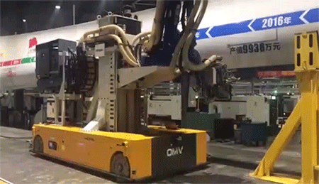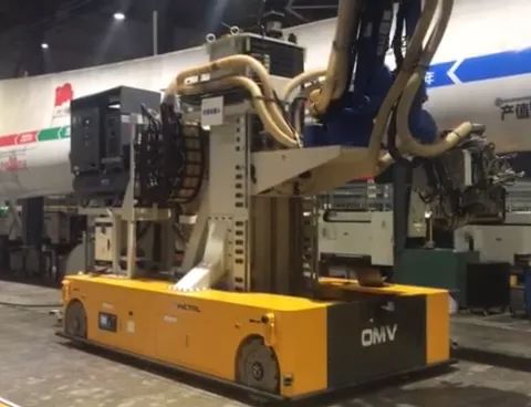 打磨机器人配备有一个OMV全向移动车,该OMV能实现前进、后退、自转、横移、任意角度斜行等全方位移动,运行速度30m/min(可调节),能够越过高度差为10mm的障碍,能通过30mm宽的沟槽;具备激光导航系统,能自行设置行驶路径,重复定位误差为±10mm。