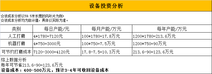 自动打磨系统拥有很高的打磨效率,打磨一个叶片的时间仅需3-4小时,其打磨效率是人工打磨的10倍以上,可24小时作业,无职业健康风险,预计2-4年可以收回设备成本。