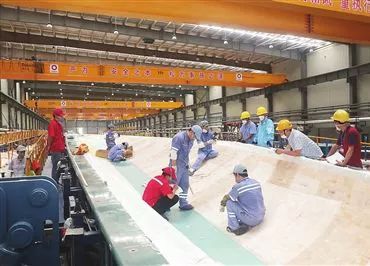 目前国内的叶片最长为83.6米,相当于30层楼那么高,重约35吨。叶片需要经过打磨、刮腻子、喷漆、切边等工序才能进行有效工作。