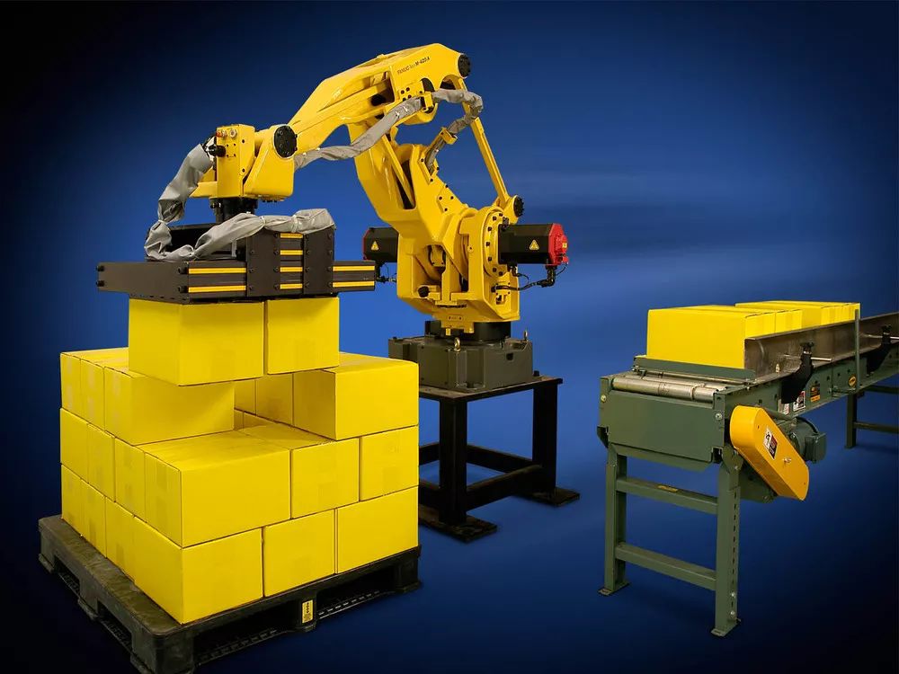 工业机器人也可实现自动抓取产品自动将产品按照规定样式码垛到规定区域码垛完成后自动将码好垛的托盘运输到规定区域。
