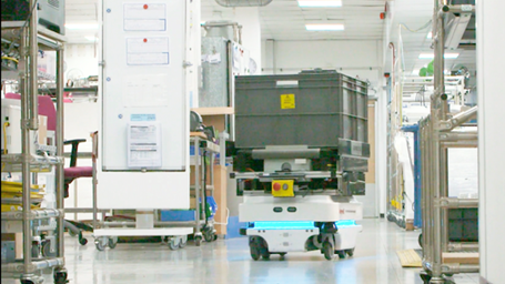最多载重100公斤的MiR100机器人在霍尼韦尔生产车间内往来运输