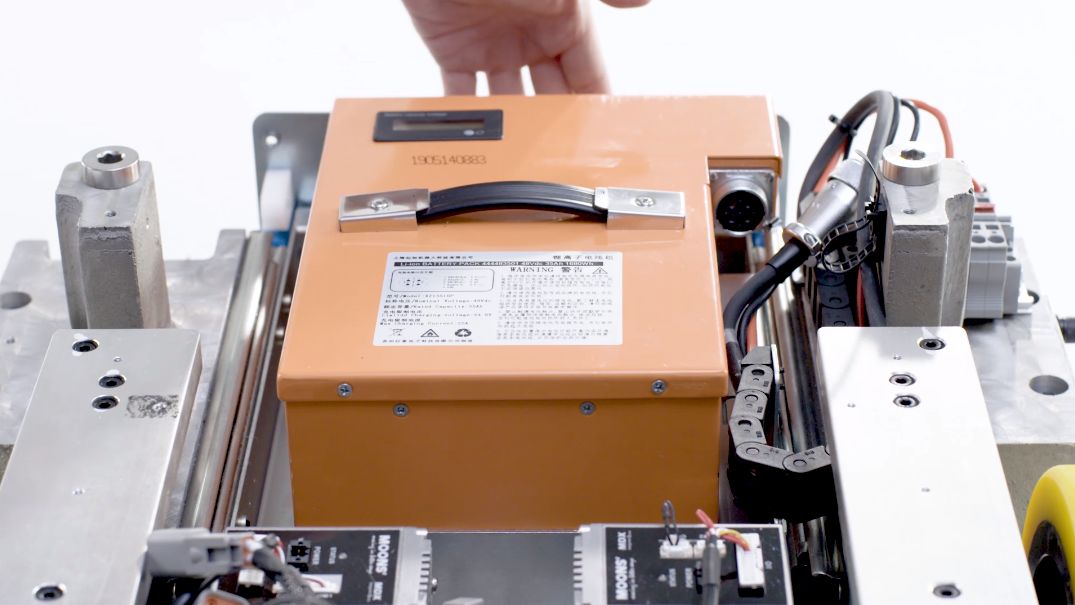 第六步,安装电池。电池是移动机器人动力来源,根据实际使用情况可选择24V或48V高容量锂电池,放置于电池仓中,支持快换。
