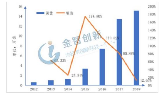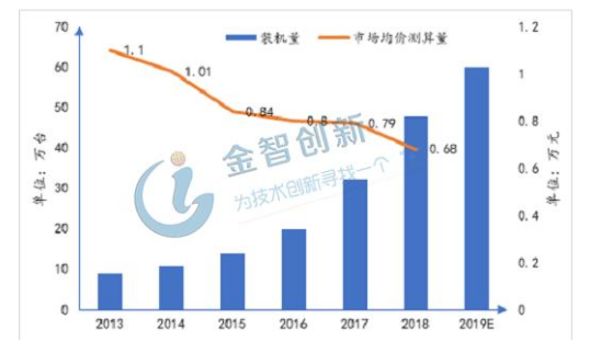 2018年国内工业机器人减速器总装机量47.40万台,近三年年均复合增长率超过50%,下游市场需求增长迅猛。其中增量为37.28万台,存量更换为10.18万台。根据新产业智库预测,2019年装机量约为60万台。从历年的减速器价格走势来看,随着市场规模的扩大,市价在逐年下降,2013年至2018年,6年内均价从1.1万元下降至0.68万元。