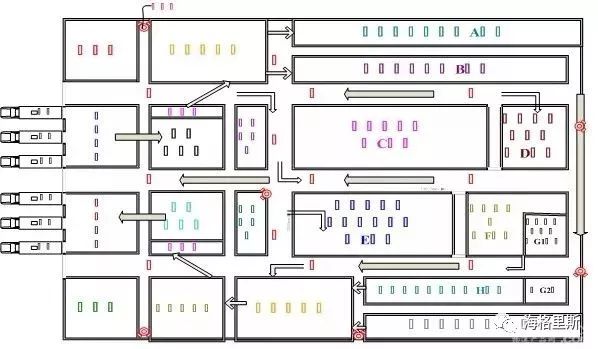 (4)中心内部的通道:一般而言,人的单行道尺寸为0.6m,双向道为1.2m,手推车单行道为1m,叉车直行的通道约1.5m,垂直作业是则是2.5m——4.0m,除此之外还需参考托盘的尺寸大小。