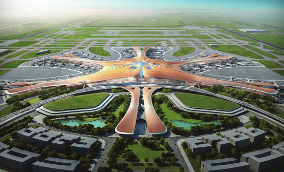北京大兴国际机场作为20年来全球范围内规划新建设的最大机场之一,被英国《卫报》誉为“新世界七大奇迹”之首;作为超大型国际航空综合交通连接枢纽,是未来世界最大的空港,也是中国国家形象展示的新国门。北京大兴机场总占地4.1万亩,规划建设7条跑道,远期(2040年)按照客流吞吐量1亿人次,飞机起降量80万架次约140万平方米的航站楼,机场预留控制用地按照终端(2050年)旅客吞吐量1.3亿人次,飞机起降量103万架次,九条跑道的规模预留。大兴机场航站楼形如展翅的凤凰,寓意凤凰展翅,阳光下闪耀着金色光泽,以灵动的姿态,吸引着全球的目光。