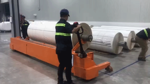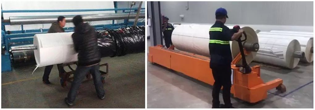 现有的生产车间布料卷筒进行搬运时,一般是将其放置到平板推车上进行搬运,而平板推车一般比较低,需要人工将布卷从平板上抬起,费时费力,效率低,人工劳动量大。