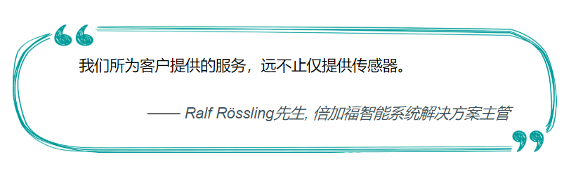 如今,作为“您身边的自动化专家”,倍加福面向中国市场客户提供定制化服务。倍加福智能系统方案事业部,为工业行业提供完整解决方案,依托公司强大的自动化控制和软件开发团队,为客户构建可靠、可视化、可运营的交互式现场管理平台,实时的有效管理,优化公司生产流程,实现数字化转型,提升智能化水平,协助客户获取更强的市场竞争力。创新实践“工业 4.0”的精神与热情,正激励着我们:以智慧感知未来,以科技改变生活,为客户开启“全新智造” 时代。倍加福期待与您携手追求卓越,创造辉煌!