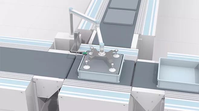 输送线连接起复杂分段式生产工厂中的独立生产站,以优化中间产品的生产流程。输送线上每个运输箱内的物品数量可以不同。当箱子到达生产站时,抓手逐一移除箱内的物品,用于制造过程中的后续步骤。