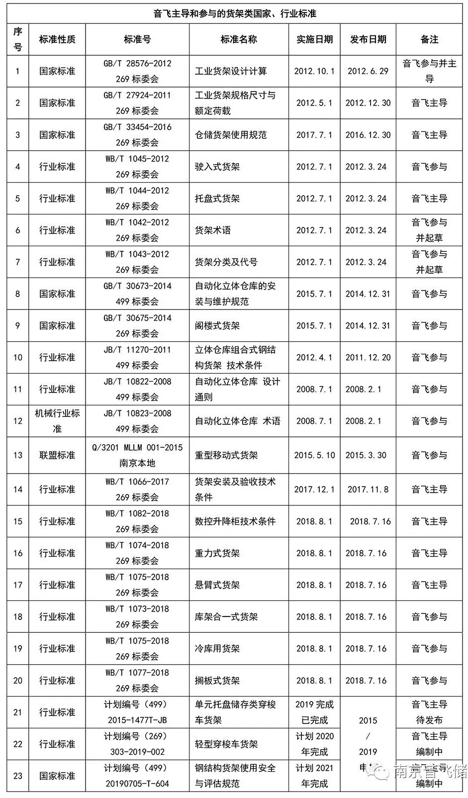 本项目是根据国家标准化管理委员会《关于下达第一批推荐性国家标准计划的通知》(国标委发[2019]11 号),计划编号20190705-T-604,项目名称“钢结构货架使用安全与评估规范”,主要起草单位:南京音飞储存设备(集团)股份有限公司,计划应完成时间2021年。