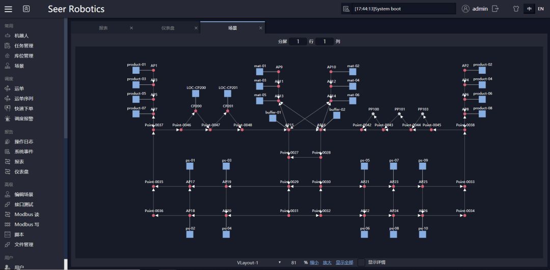 同时,可视化管理系统RoboGlue中有场景功能,能够实时监控移动机器人运行位置,从而能够通过RoboGlue实时掌握全局物流信息状况。