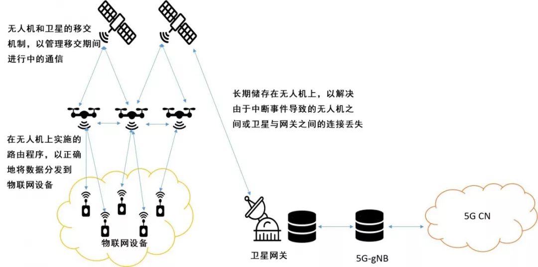 当然,这类复杂的集成技术也无可避免的面临着许多挑战。譬如在路由技术方面,5G-UE包含5G通信的用户端点,即5G CN无法看到链接到无人机的多个IoT设备。必须在无人机上实施适当的机制,以允许它们正确分配发往IoT设备的数据(命令、请求等);在移交技术方面,无人机是通过遵循预定的路径来更改其位置,但若卫星是非对地静止卫星,它们的信号并不总是覆盖固定区域,这就意味着IoT设备无法始终链接到同一无人机,并且无人机也无法恒定链接卫星,在这些不同种类的切换事件期间,需要适当的切换机制来管理正在进行的通信;在长期存储技术方面,由于无人机和卫星之间,或卫星与卫星网关间链路的不可预测故障,无人机可能会暂时与5G CN断开连接,这将带来通信的衰减甚至中断。