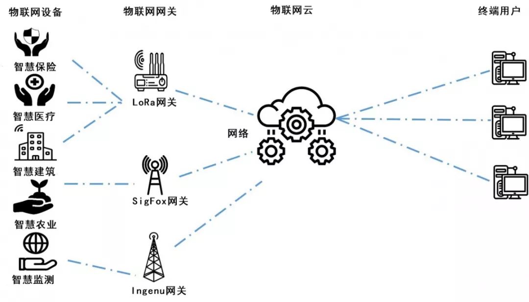 在讨论卫星、无人机与5G地面网的集成方式之前,首先需要明确的是远程物联网的架构模式。如图1所示,物联网设备通过作用于数据链路和直接封装物联网应用程序数据的物理层的技术,将其数据传输到品牌定义(例:LoRa、SigFox或Ingenu)的网关。所有涉及的协议都是经过严格品牌定义的,每个网关都是协议转换器,将私有IoT应用程序封装到Internet协议栈中,以传送到物联网云。其中品牌定义的服务器会将应用程序层从IoT应用程序转换为对于终端用户适合的Internet应用程序协议(例如HTTP)。