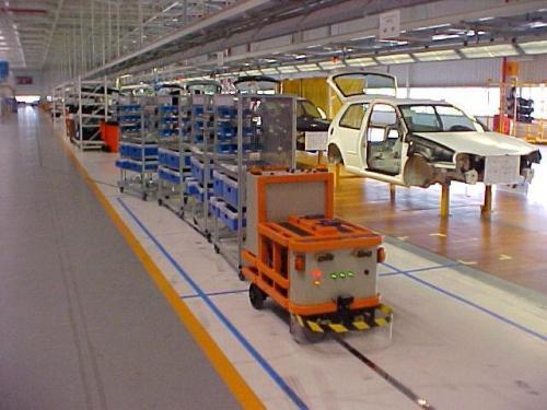 AGV在制造业的生产线中大显身手,高效、准确、灵活地完成物料的搬运任务。并且可由多台AGV组成柔性的物流搬运系统,搬运路线可以随着生产工艺流程的调整而及时调整,使一条生产线上能够制造出十几种产品,大大提高了生产的柔性和企业的竞争力。1974年瑞典的Volvo Kalmar轿车装配厂为了提高运输系统的灵活性,采用基于AGVS为载运工具的自动轿车装配线,该装配线由多台可装载轿车车体的AGVS组成,采用该装配线后,装配时间减少了20%,装配故障减小39%,投资回收时间减小57%,劳动力减小了5%。目前,AGV在世界的主要汽车厂,如通用、丰田、克莱斯勒、大众等汽车厂的制造和装配线上得到了普遍应用。
