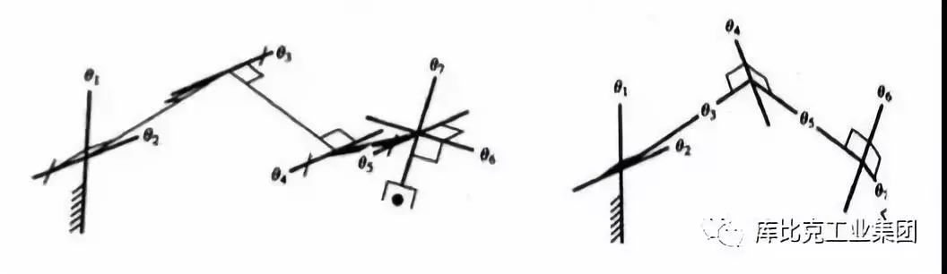 通常空间定位需要6个自由度,利用附加的关节可以帮助机构避开奇异位。下图为7自由度操作臂位形