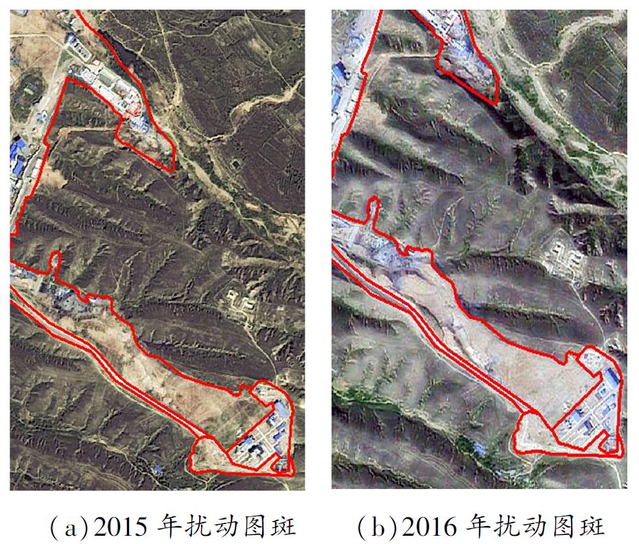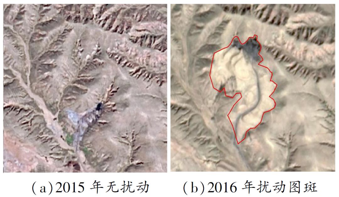 本研究遥感影像数据源为国产资源三号和高分一号全色、多光谱卫星影像,影像获取时间为2015年9—10月和2016年9—10月,资源三号全色影像空间分辨率为2.1m、多光谱影像空间分辨率为5.8m,高分一号全色影像空间分辨率为1m、多光谱影像空间分辨率为4m。原始遥感影像经几何处理、正射纠正、地理配准、融合处理、镶嵌和裁剪等流程,形成了清晰度、层次感、色彩饱和度、信息丰富度好的遥感影像,扰动图斑影像特征与其他地物差异明显。