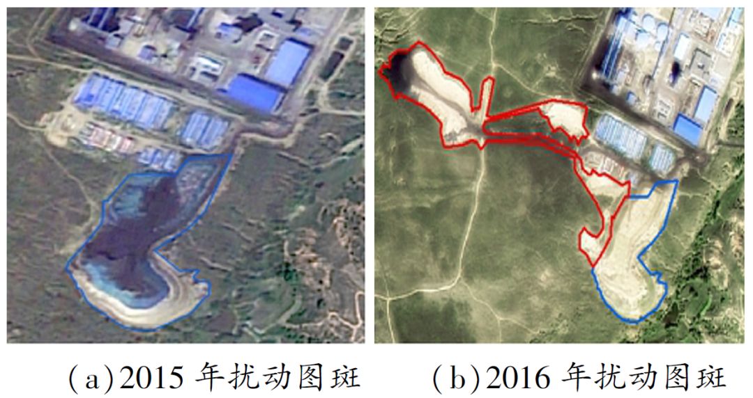 将2015年和2016年扰动图斑进行对比,分析扰动动态变化。若某个扰动图斑2015年不存在,在2016年扰动图斑中出现,则判定为“新增”,如图2 所示;若某个扰动图斑2015年已经存在,2016年也存在且相连处有新扰动,则判定为“扩大”,如图3 所示;若某个扰动图斑2015年已经存在,2016年也存在且未发生变化,则判定为“未变”,如图4所示。