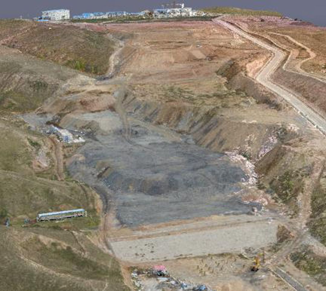 使用Pix4 Dmapper软件处理原始数据,形成数字表面模型(DSM)、数字正射影像图(DOM)和三维模型等成果,如图5、6、7所示。在ArcGIS中,利用DSM和DOM成果,获取经纬度、高程等位置信息;在Pix4 Dmapper软件中,利DOM成果,勾绘出弃渣场的范围,获取弃渣场面积;利用DSM成果,量算堆渣高度、坡度,勾绘弃渣场的范围,通过已知控制点与设计方案中的地形数据进行挖填方计算,获取弃渣量。