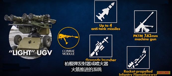 3、UGV支持和识别“可运输”,它重达2吨,此UGV有不同的配置。战斗模块包括: