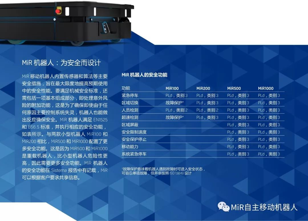 MiR机器人满足EN 1525和美国相应标准ANSI / ITSDF标准B56.5-2012,产品设计面向未来标准,如ISO/FDIS 3691-4、ISO/FDIS 10218、RIA 15:08以及UL 3100,配备各类相关安全功能,以确保即使主要安全功能发生故障,机器人也能做出反应确保安全。MiR机器人的安全功能在Sistema报告中有记载,MiR可以根据客户要求共享信息。