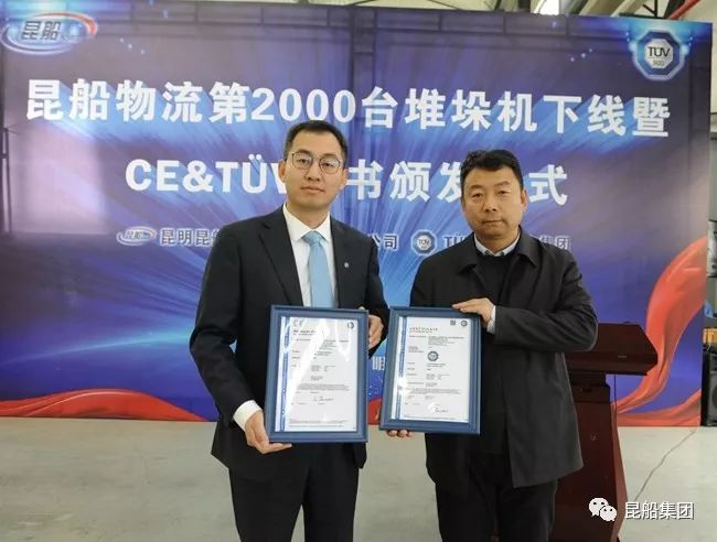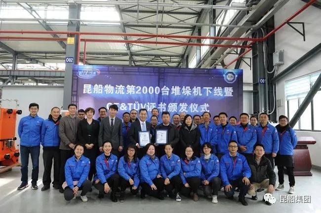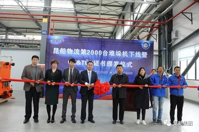 12月5日, 中国船舶昆船物流公司召开第2000台堆垛机下线&TUV证书颁证仪式,物流公司党委书记徐信荣、TUV南德意志大中华集团工业产品部大中华区经理李太伟一行,参加了此次仪式。