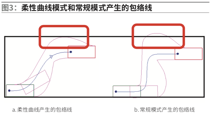 图3为柔性曲线模式和常规模式产生的包络线,它们的起点和终点坐标均相同,如红框所示,柔性曲线模式占用的空间明显较小。