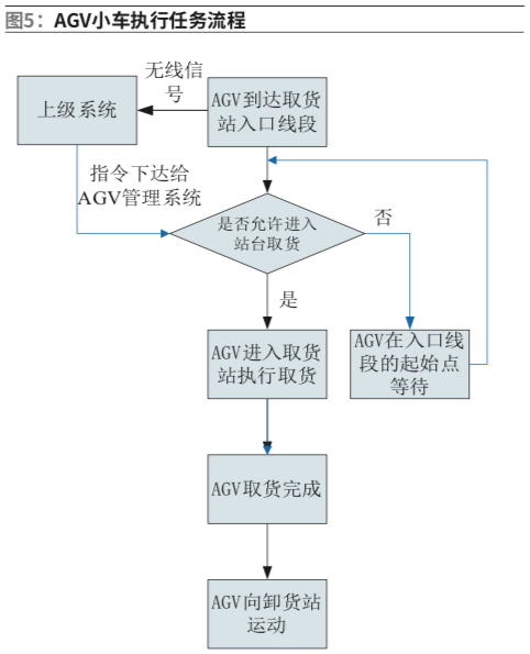 AGV小车与其它物流设备有信息交互,为保证安全生产,AGV小车在取货、卸货、取货完成、卸货完成时均会向上级系统发出请求以及完成确认信息,待上级系统给出指令后,AGV小车方可执行任务,具体流程如图5。