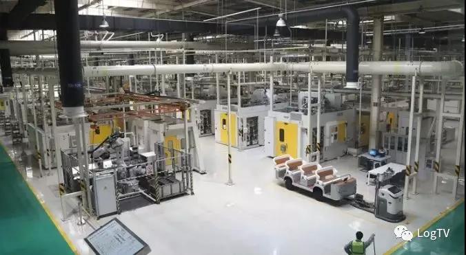 惠山工厂内的工人数量并不多,很多复杂的工序都是由工业机器人完成。车间内部,AGV小车载着曲轴等零部件来回穿梭,再结合空中连廊、自制件立体库、冷试SPS等系统,共同构建装配线全自动智能内部物流系统。