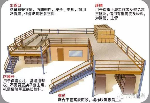 是在已有的钢平台或工作场地上建造一个中间阁楼以增加储存面积。这种钢平台可以减小承重梁的跨距,降低建筑费用,提高仓库的空间利用率。阁楼楼板上一般可放轻泡及中小件货物或储存期长的货物,可用叉车、输送带、提升机、电动葫芦或升降台提升货物。