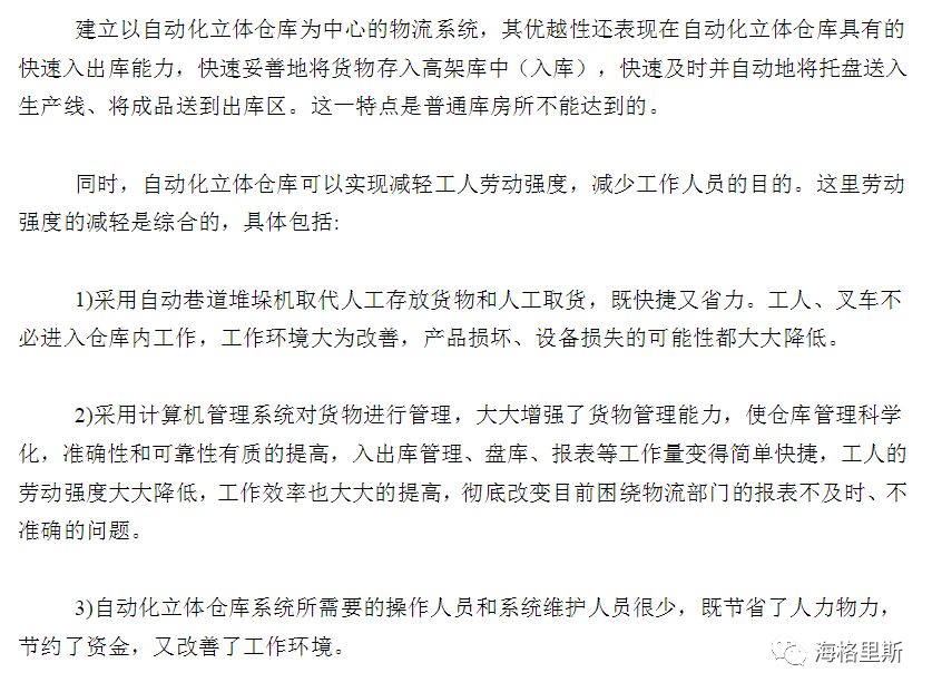海格里斯在建设自动化立体仓库上的建议是,在规模及出入库频率要求相同的情况下,从投资角度分析,建设自动化立体库比建设高位叉车库房节约,且自动化立体库房每年的运行费用比高位叉车库房低。从管理角度分析,建设自动化立体仓库会提高工作效率,可以解决目前困扰物流部门的报表不及时、数据不准确、库损严重、错误发货、人员管理混乱、安全事故多等许多问题。