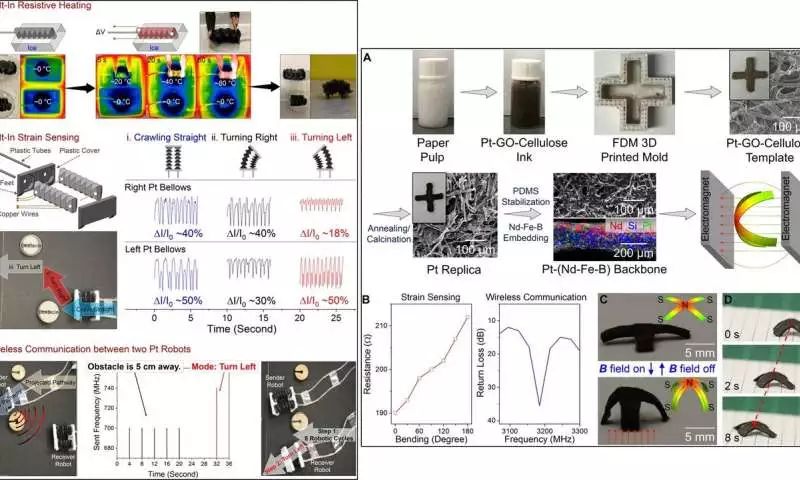 该研究团队复制用薄弹性体制成的铂金折纸结构,以形成多功能骨架,从而创建新的折纸机器人。与使用其他材料建造的机器人相比,这些新型机器人具有更高的变形性,阻燃性和能效。杨等。观察到了新型铂金机器人(Pt机器人)的新增功能,包括按需电阻加热,应变感应和不带外部电子设备的内置天线。为了获得更多功能,它们包括实时监视或记录机器人运动,机器人之间的无线通信,热量调节和磁控制。这项新工作丰富了机器人材料库,以设计通用的软机器人。
