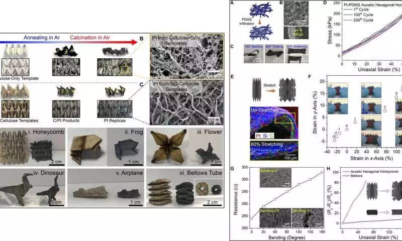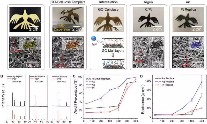 这种金属基材料是由团队开发的一种新工艺生产的,该工艺称为“氧化石墨烯启用的模板合成”。首先将纤维素纸浸入氧化石墨烯溶液中,然后再将其浸入由金属离子(例如铂)制成的溶液中。然后将材料在惰性气体氩气中于800°C,然后在500°C的空气中燃烧。