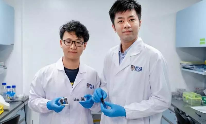 国大助理教授陈宝仁(右)和博士生杨海涛(左)及其团队创造了一种新型金属材料,用于柔软灵活的机器人。来源:新加坡国立大学