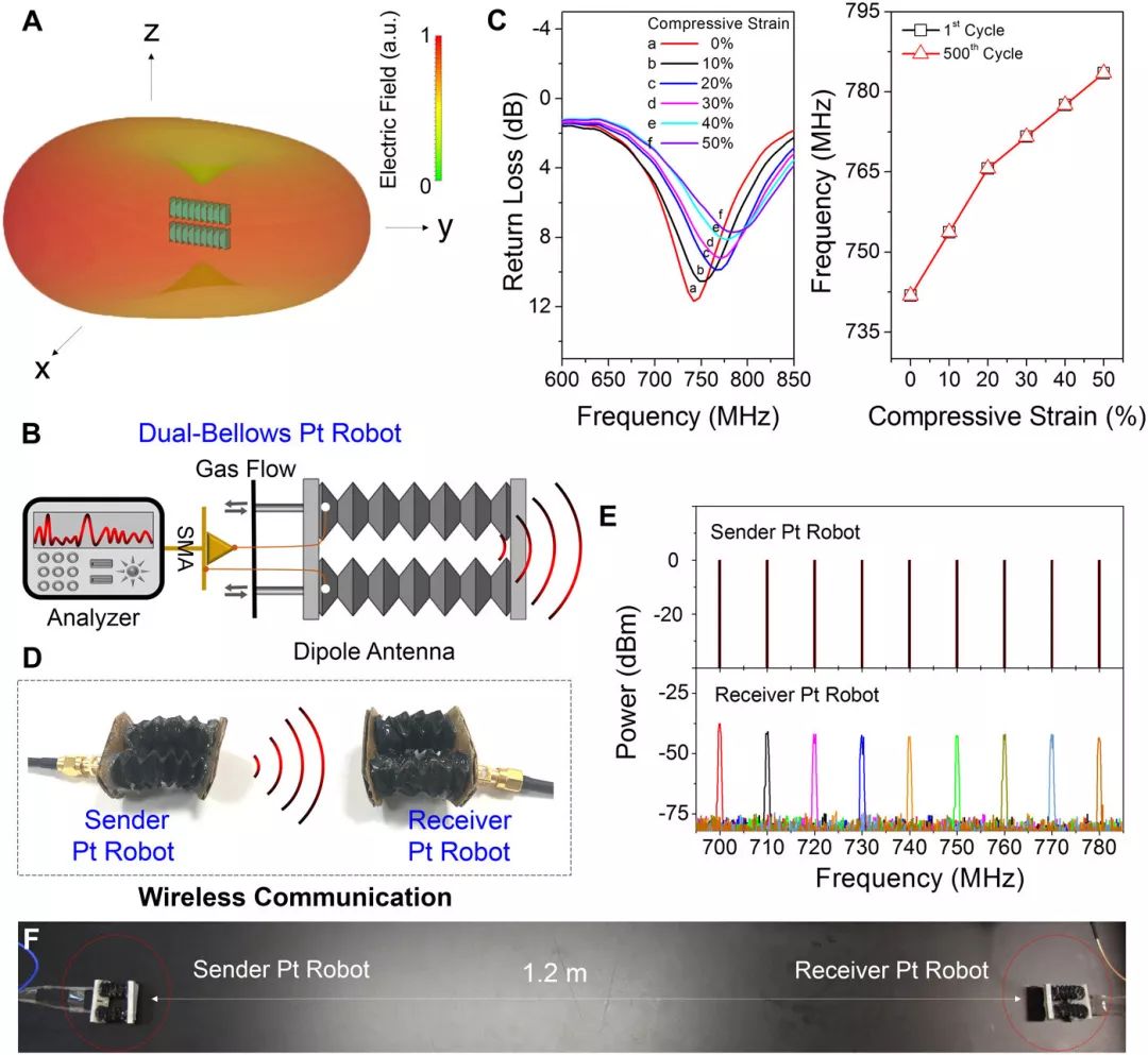 具有内置无线通信功能的Origami Pt机器人。(A)在0%应变下于741.8 MHz的两个Pt弹性波纹管的模拟3D辐射方向图。(B)双波纹Pt机器人的示意图,该机器人也用作可重配置的偶极天线。(C)左:可重构偶极天线在0至50%的不同压缩应变下的回波损耗。右图:共振频率是500次循环机器人致动前后压缩应变的函数。(D)发送器Pt机器人(发送信号)(左)和接收器Pt机器人(接收信号)(右)的照片。(E)脉冲信号(发送方Pt机械手已发送)被接收方Pt机械手很好地接收。发送信号的频率与接收信号的频率相同。(F)两个Pt机器人能够跨1.2米的距离进行远程通信。