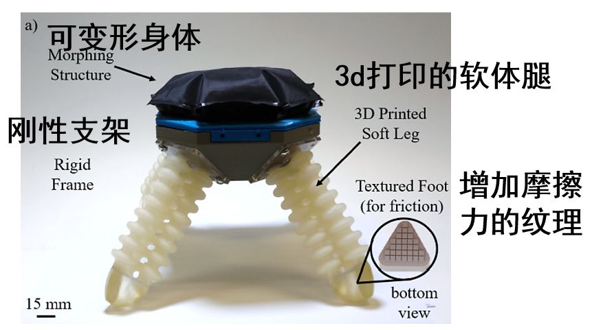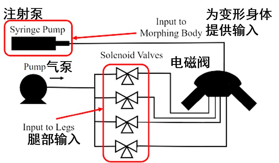 这款机器人基于气动/液压软体驱动器技术。如下图展示了机器人的结构设计。可形变身体和4条腿安装于一个刚性的支架上。腿部由3d打印的弹性材料制成,每条腿有三个腔体,从而控制向不同的方向弯曲。机器人的身体变形部分是由两个充气小袋组成的。机器人的腿部连接到传统气泵,由电磁阀控制,机器人的身体连接到注射泵。